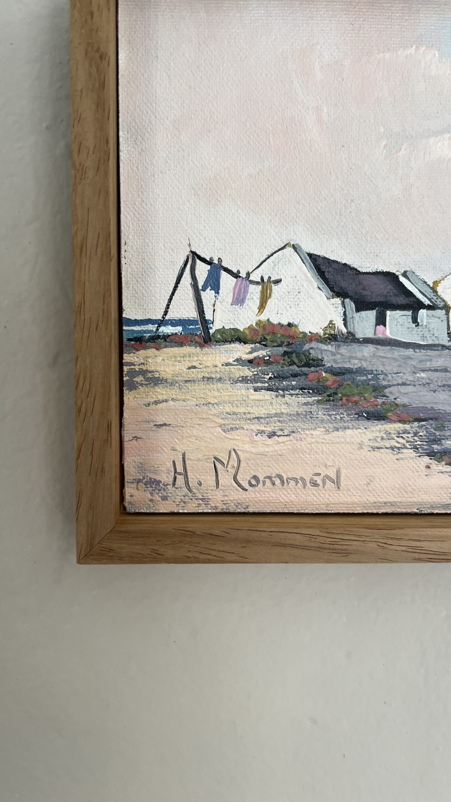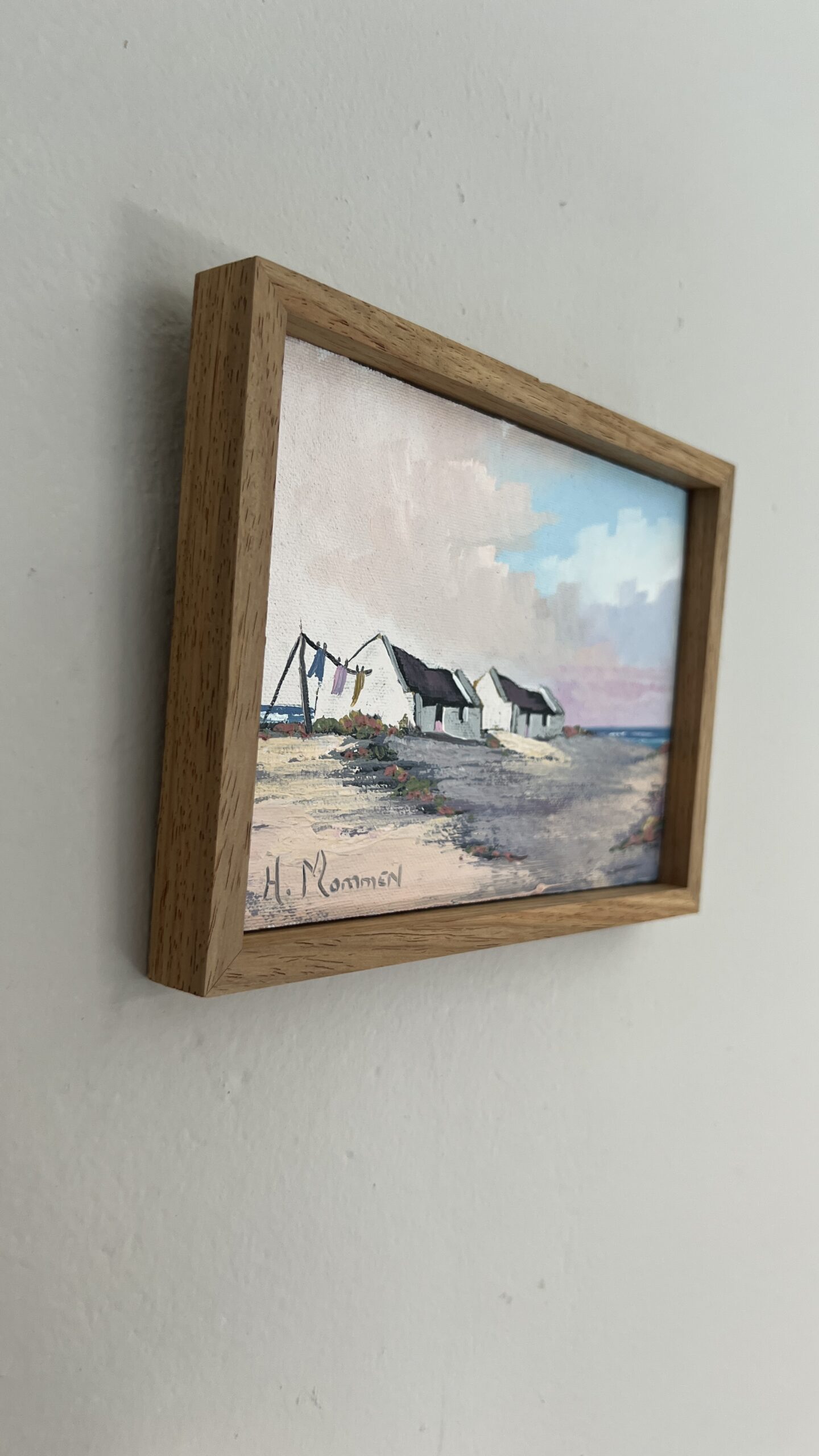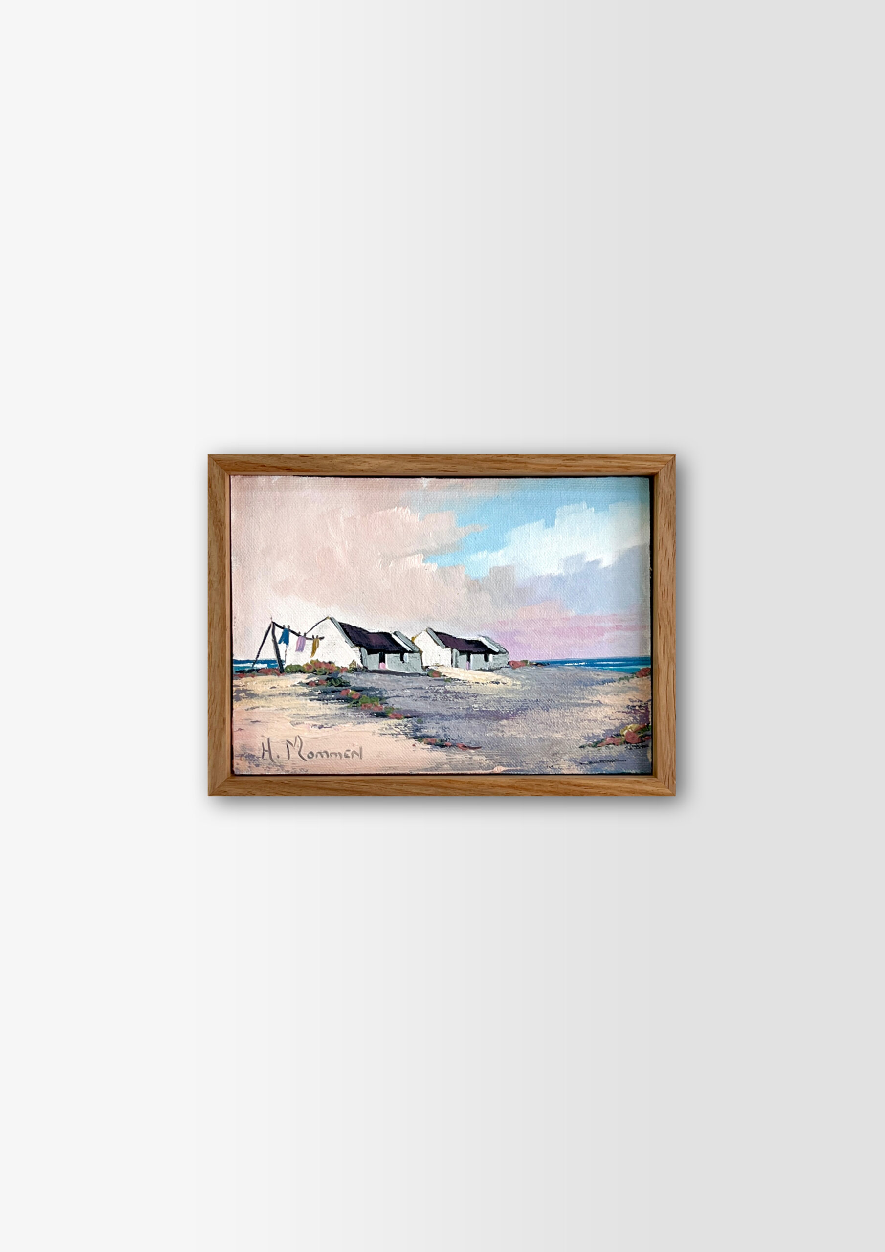 An original oil on board by South African artist H. Mommen. The scene evokes the quiet charm of a coastal village — whitewashed, thatched cottages nestled along the beach, their walls touched by salt and sunlight. Hints of a pastel sky drift above, and a simple clothesline sways gently in the breeze. A tender study of seaside stillness, reminiscent of Arniston’s timeless calm.