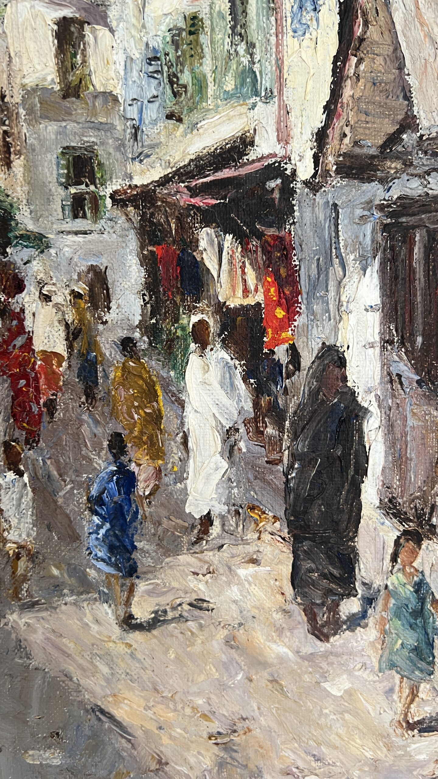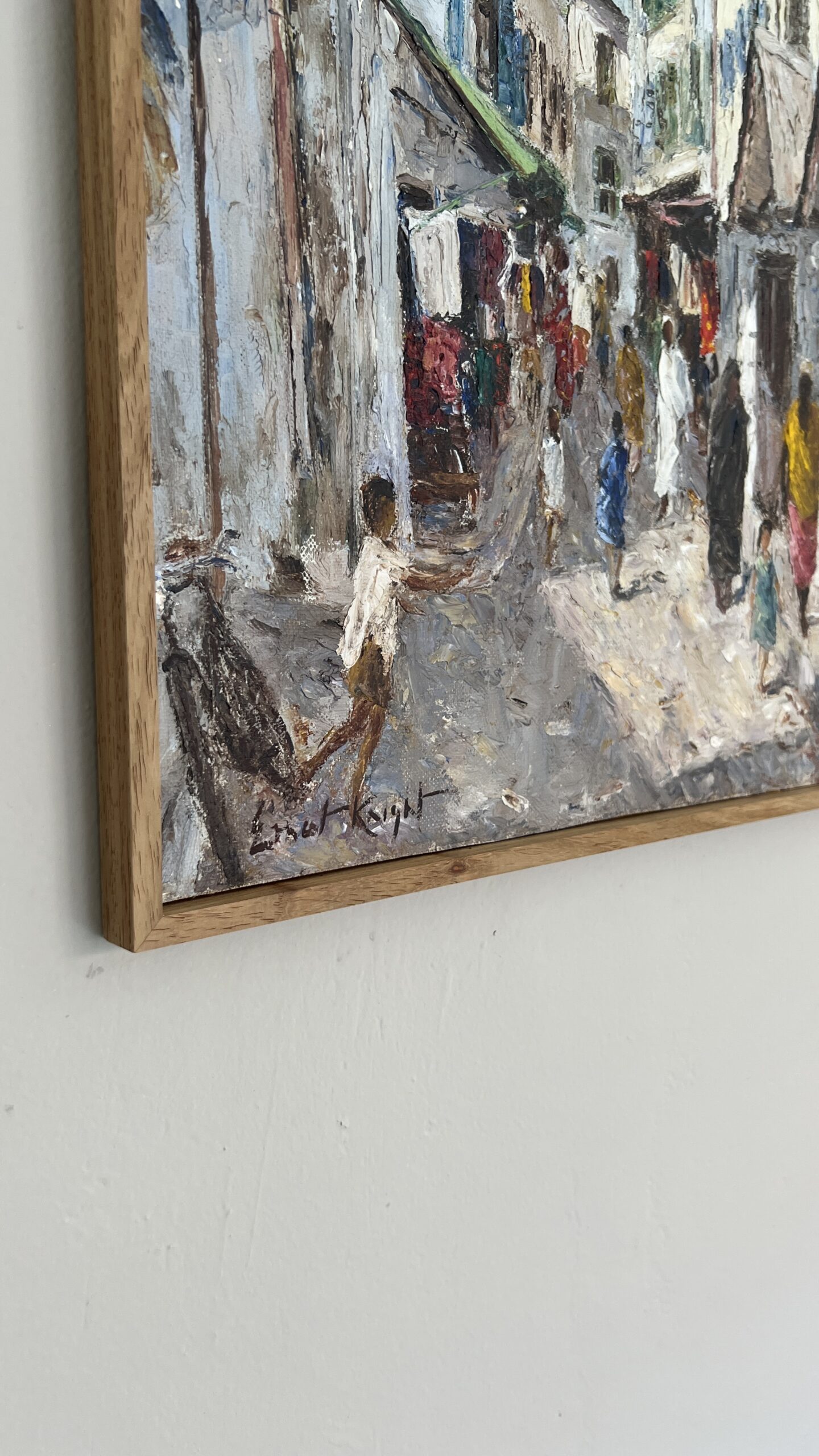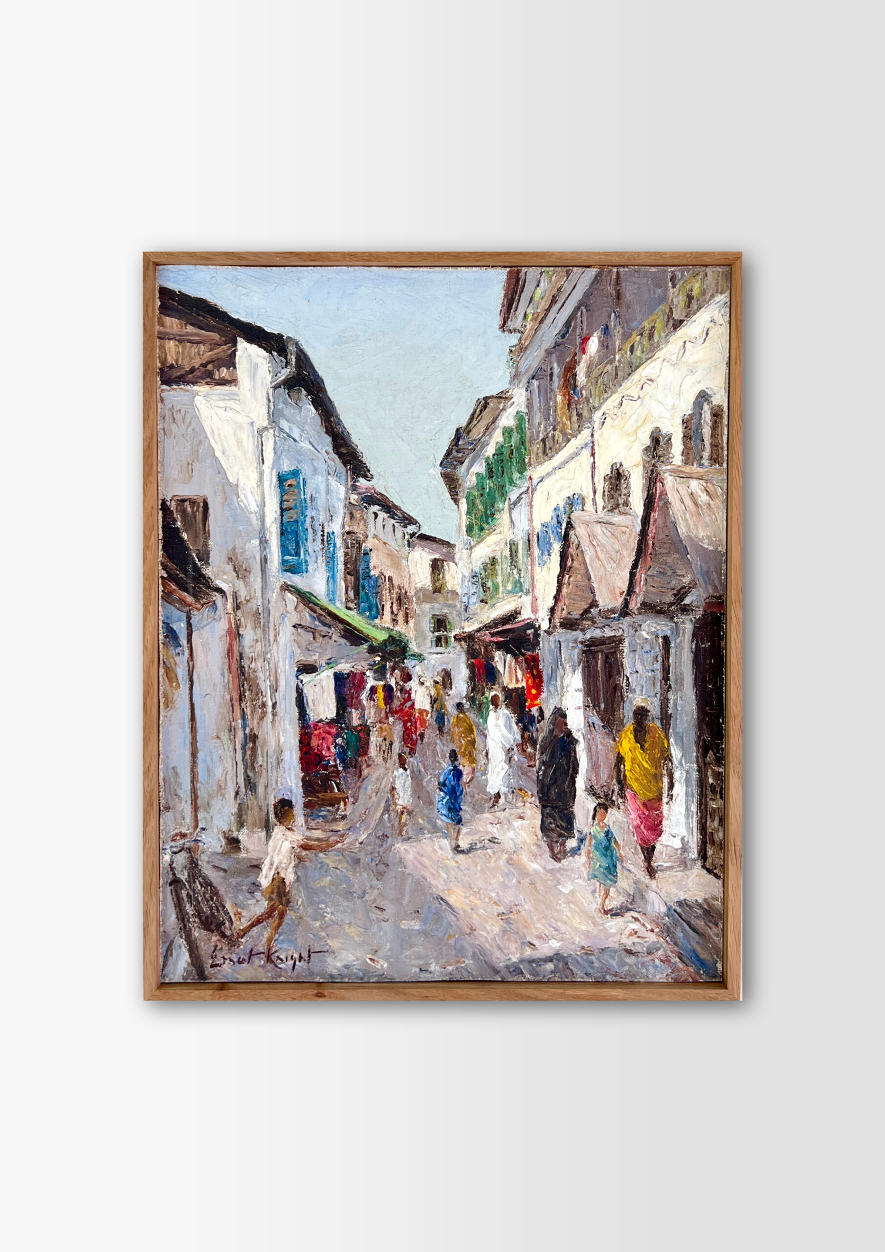The painting style uses visible, thick brushstrokes and has a textured, impressionistic feel. A signature, ” Knight,” is visible in the bottom-left corner of the painting. The style and subject matter of the painting are similar to artworks of South African artist George Enslin, who painted street scenes. It is also similar to a painting of a fruit stall in Zanzibar by Pieter Hugo Naudé.
