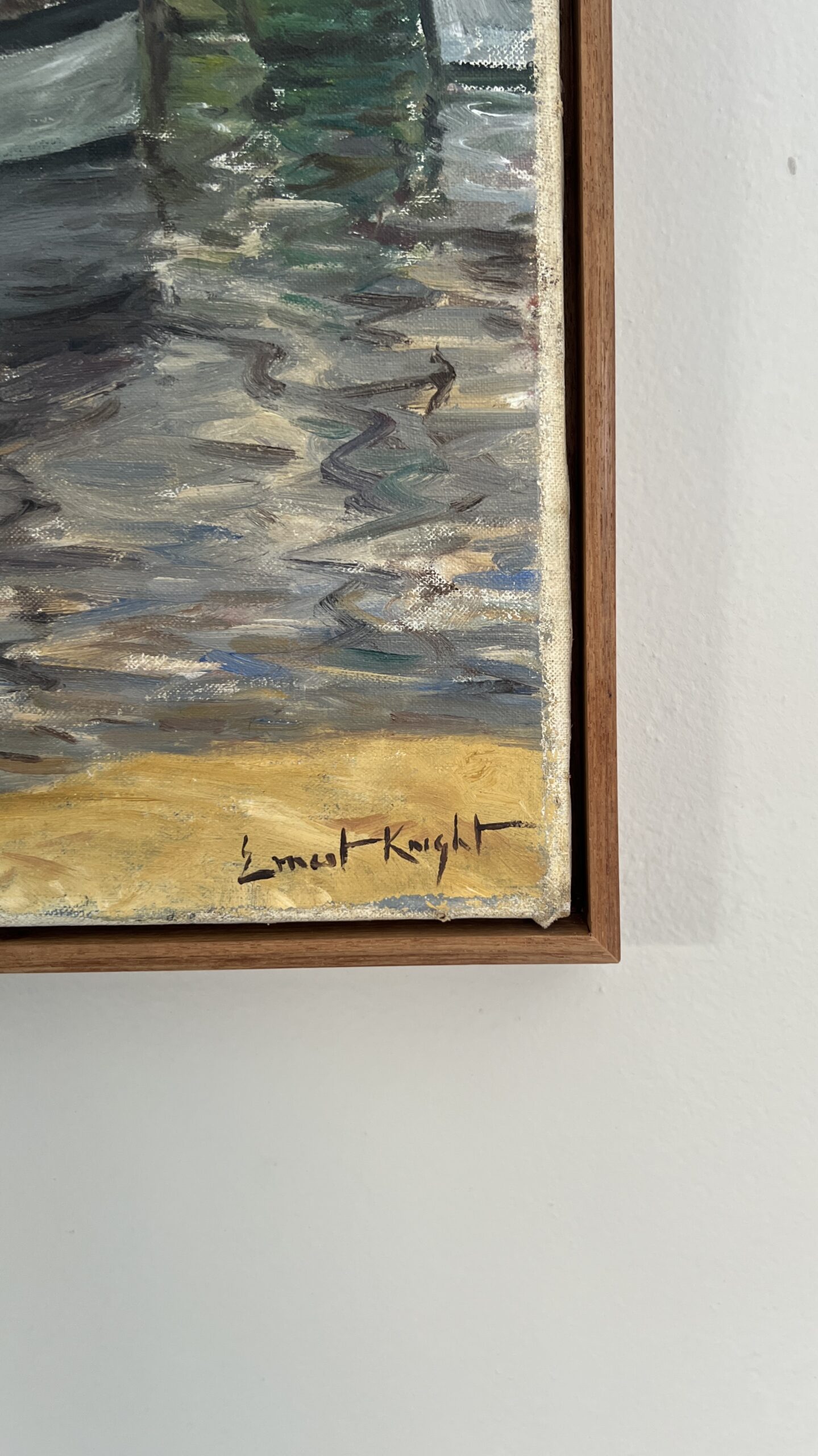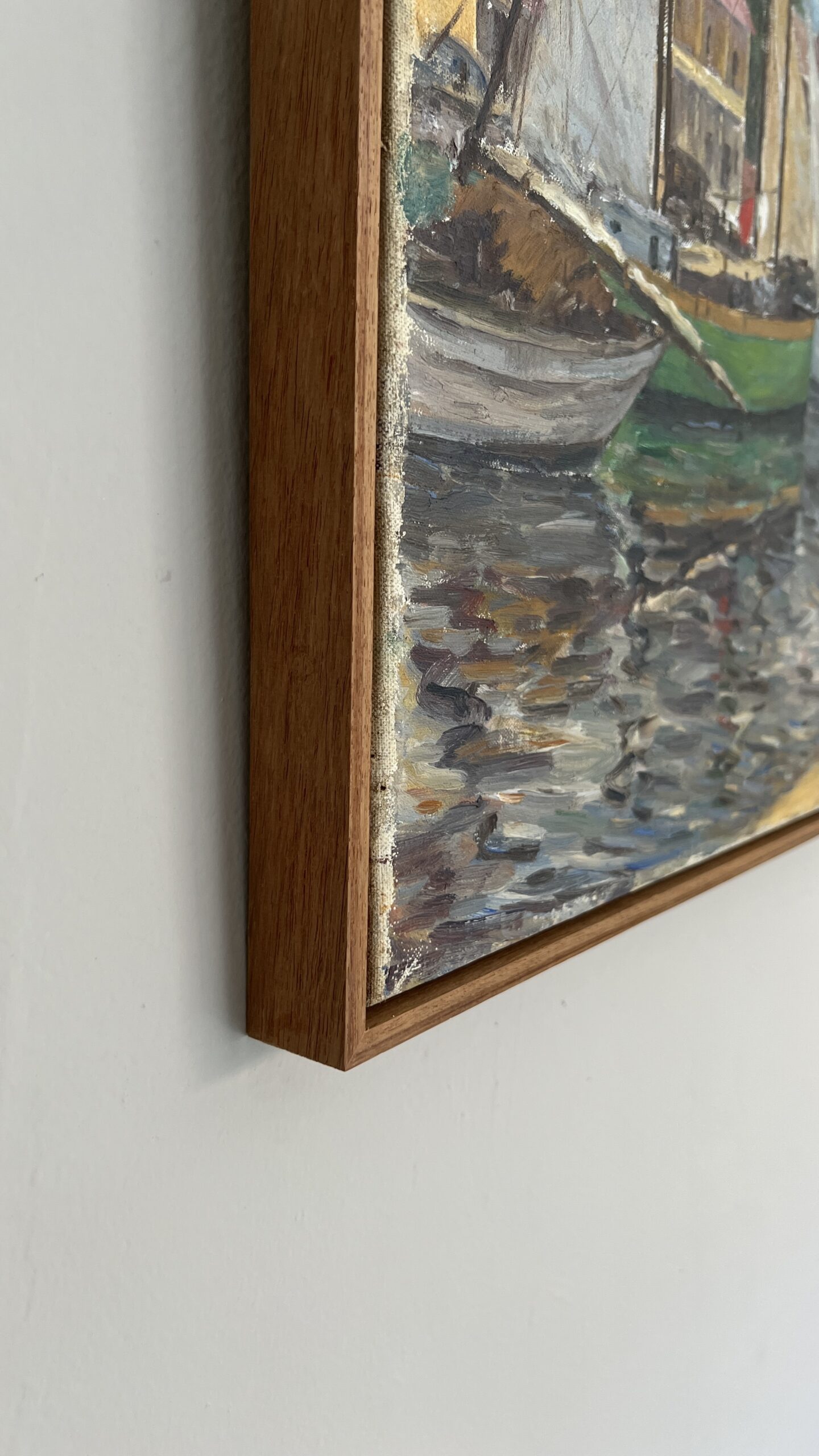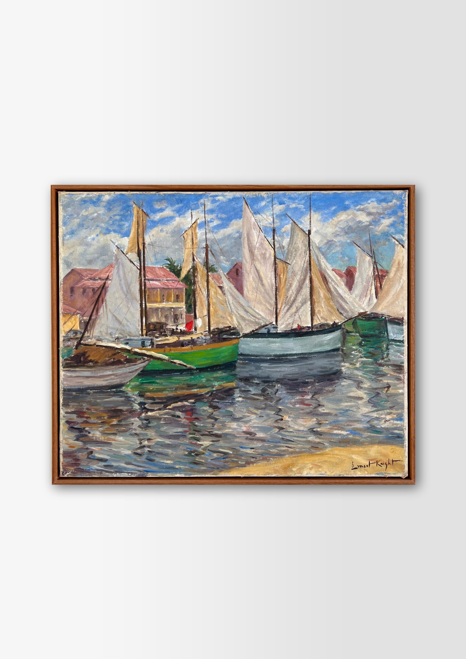 The painting depicts a group of sailboats moored in a harbour, with colourful buildings visible in the background. The artwork is done in an Impressionist style, characterised by visible brushstrokes and a focus on capturing the effect of light on the water and sails. This artwork is attributed to an artist with the same name, and visual matches suggest the style is similar to other artists who painted similar subjects and styles, including Emmanuel Pierre Charles, James Millar, and Jean Puy.