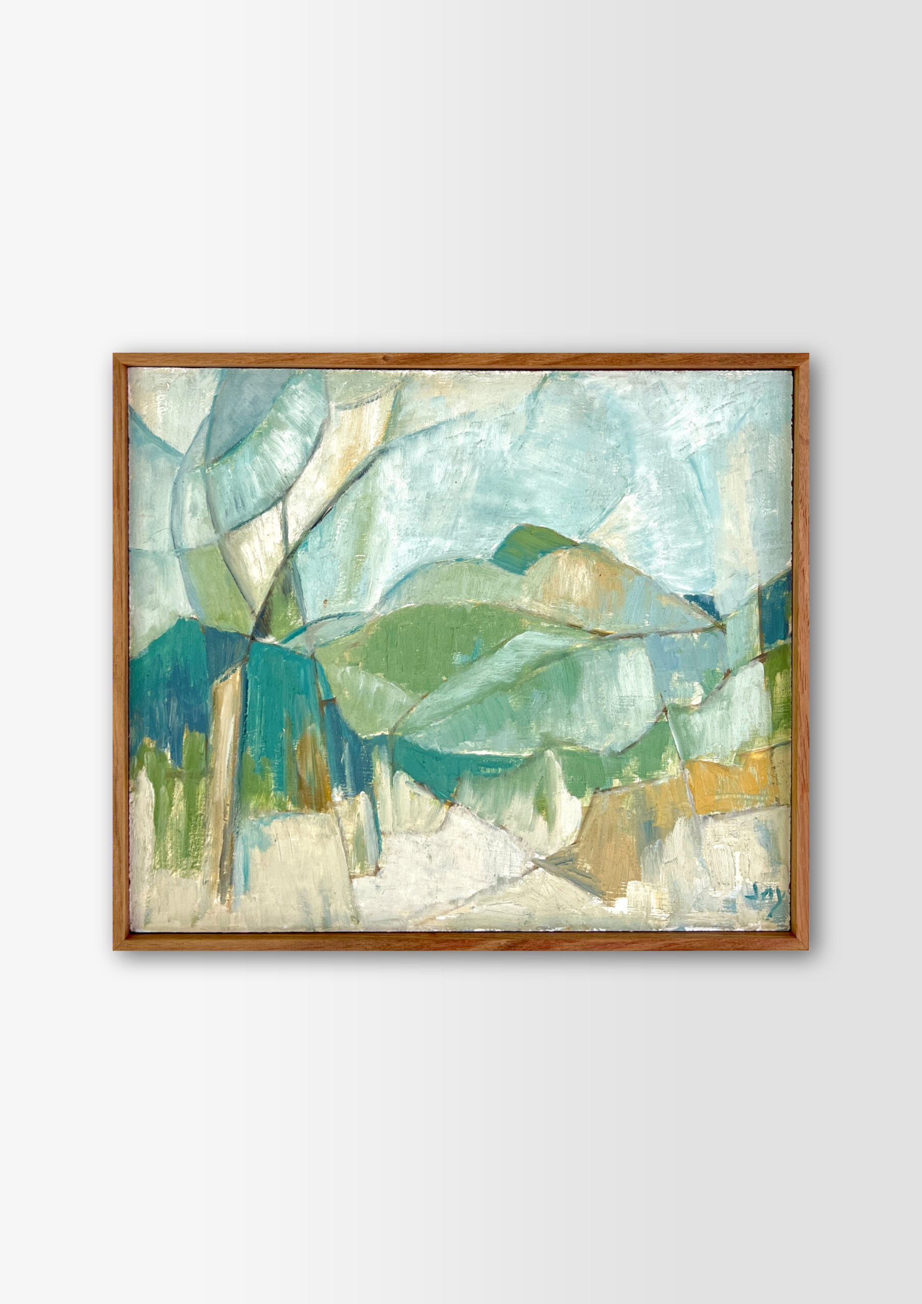 The painting is an abstract landscape featuring a composition of interlocking geometric shapes and blocks of color. The artwork has a textured appearance, and the color palette is dominated by muted shades of green, blue, white, and ochre. The style is reminiscent of Cubist and Mid-Century Modern abstract art. A small signature, possibly “Joy,” is visible in the bottom right corner of the painting. The artwork is presented in a simple wooden frame.