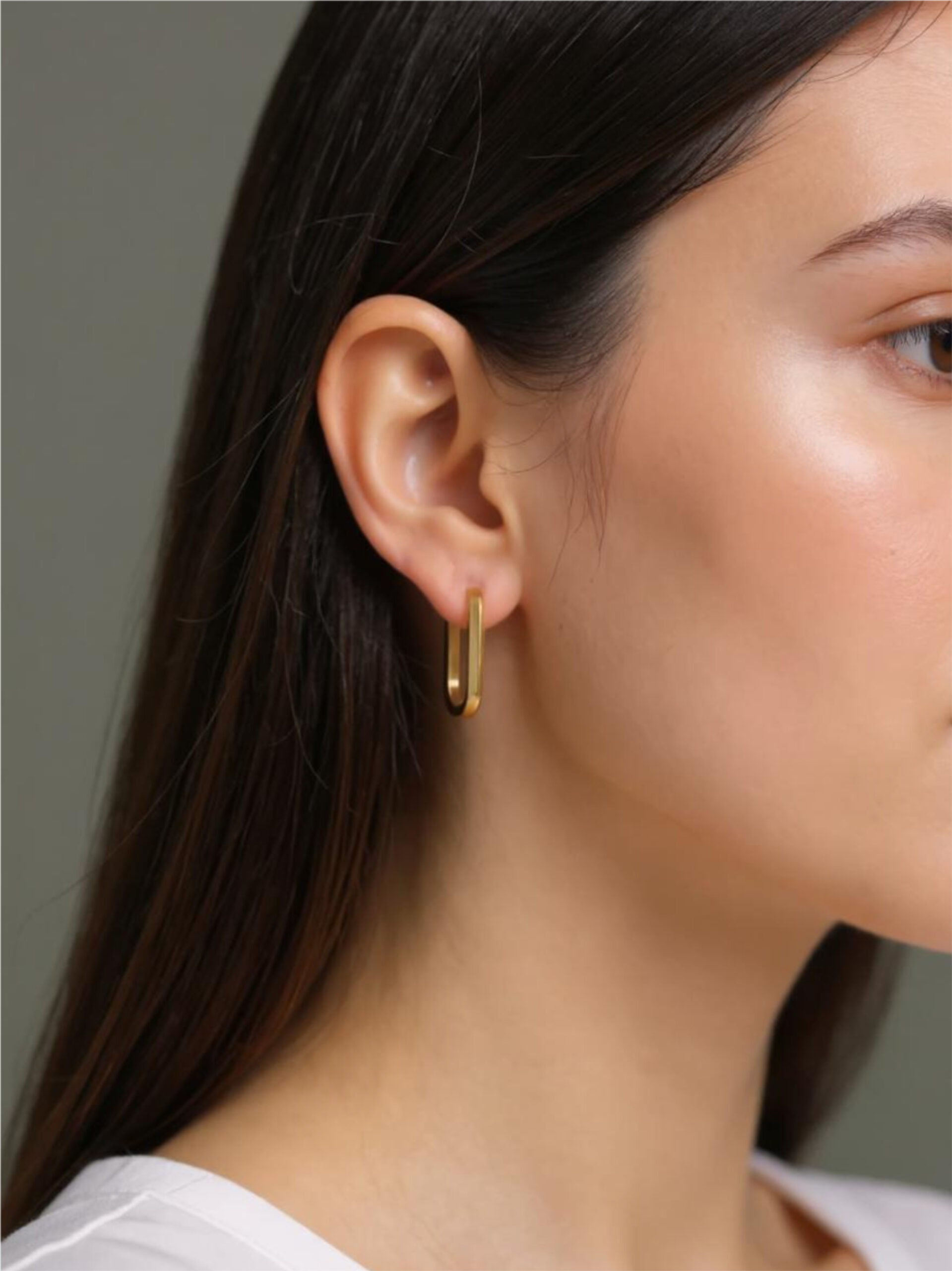 The U-shaped curve brings a subtle edge, making them the perfect accessory for both casual days and polished evenings. Tarnish-resistant and lightweight, they’re designed for daily wear without losing their glow. Whether worn solo for a clean, sophisticated look or layered with other gold pieces for a curated ear stack, these hoops are an easy wardrobe staple you’ll reach for again and again.